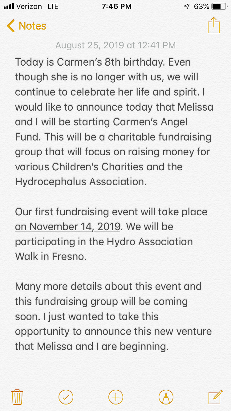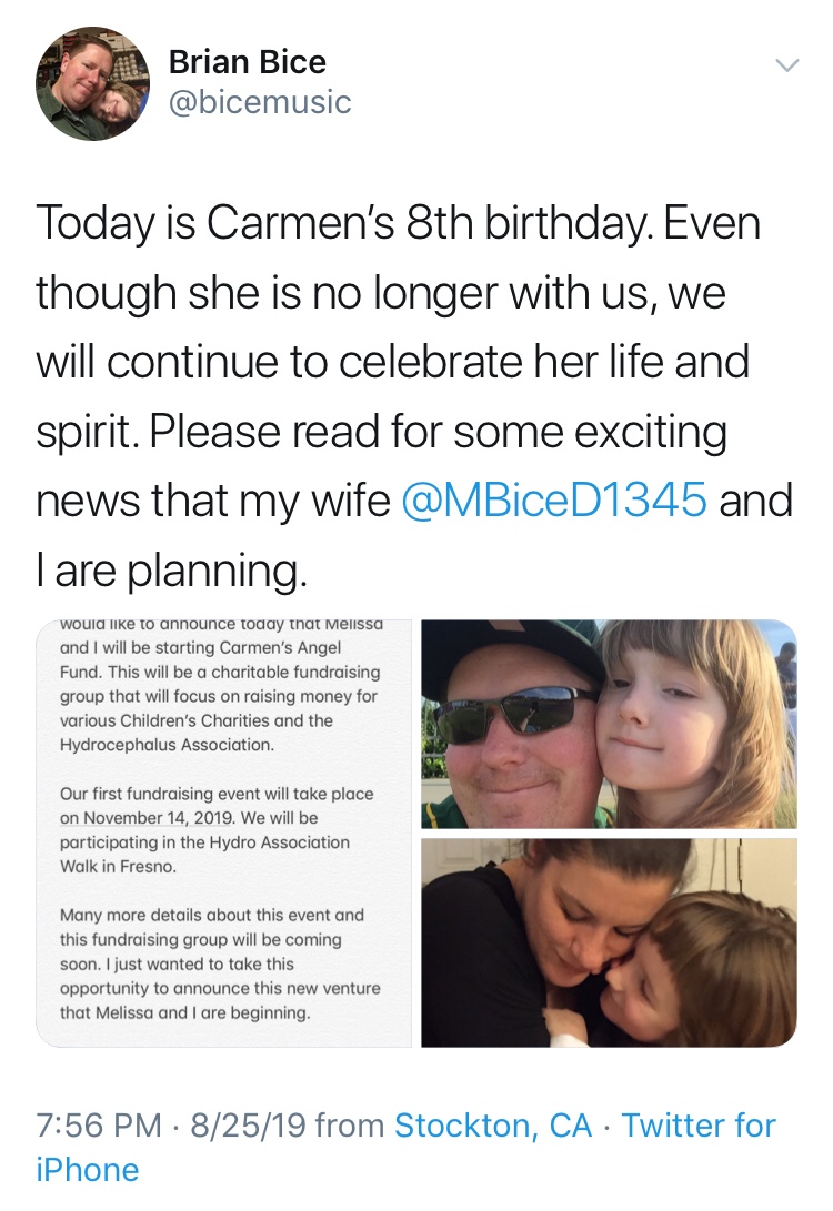 Carmen’s Angel Fund was founded on August 25, 2019 by Brian and Melissa Bice. This organization was created in honor of their daughter Carmen Madison Bice. Carmen passed away on February 28, 2019 after she suffered a catastrophic shunt failure. Carmen had a love for all things that was unparalleled. Brian and Melissa started this organization to keep Carmen’s spirit alive though raising funds and awareness for various children’s charities.