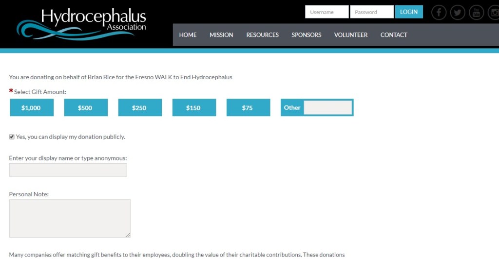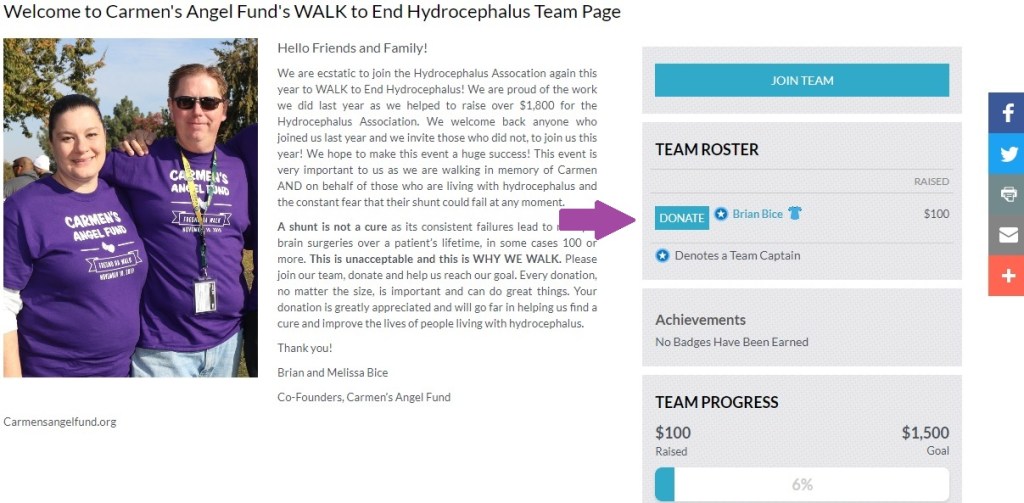 Here are some simple directions on how you can donate to Carmen’s Angel Fund’s team for the Walk to End Hydrocephalus in Sacramento on September 26, 2020. First off click the link below to go to the team page.